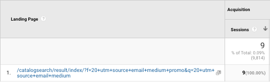 If you see ANY results, those landing pages are not awesome. This example above shows how some “+” signs made it into the URL instead of “_” in the UTM parameter names, and there are no “&” separators between UTM parameters. Both things killed this URL. How do we know it’s useless for our intended attribution purposes?